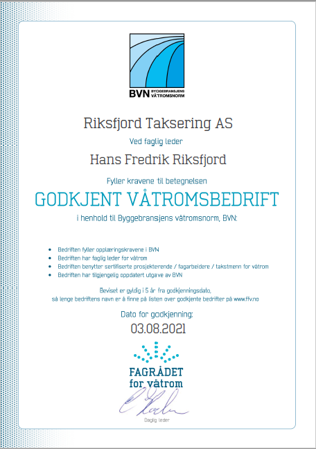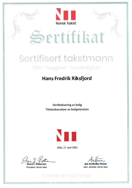 Takstingeniør og Byggmester med teknisk fagskole og utdannet byggingeniør. Riksfjord Taksering er medlem av Norsk takst og er godkjent våtromsbedrift. Det utføres verditakst, tilstandsrapport, tomtetakst, forhåndstakst, reklamasjonstakst, trykktest, uavhengig kontroll, bistand på overtakelse og ettårsbefaring, byggelånsoppfølging, m.m.