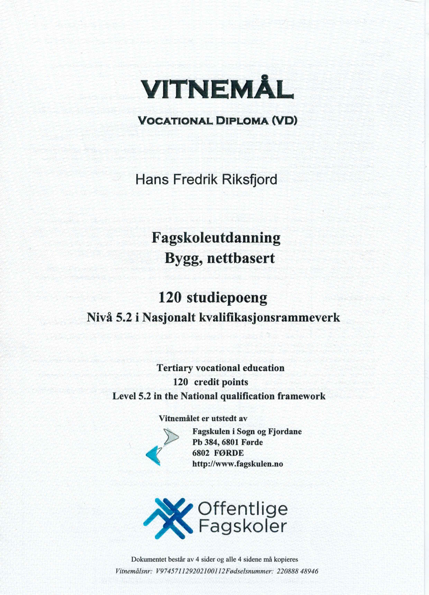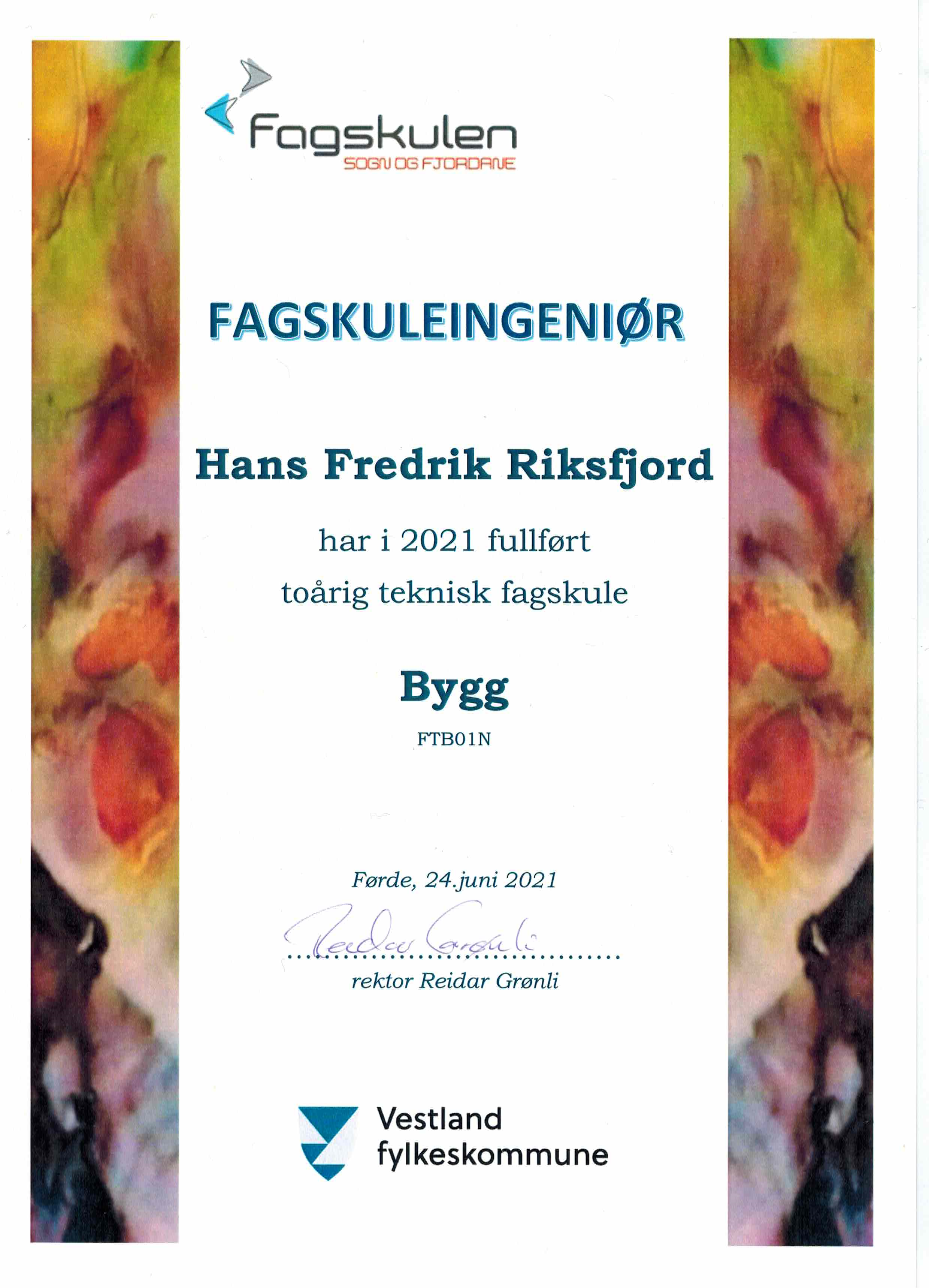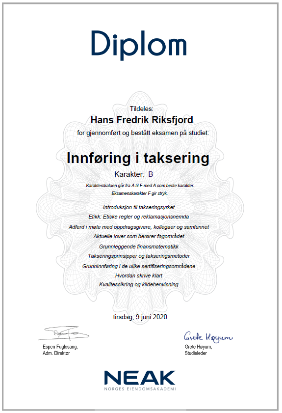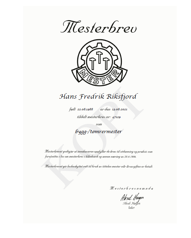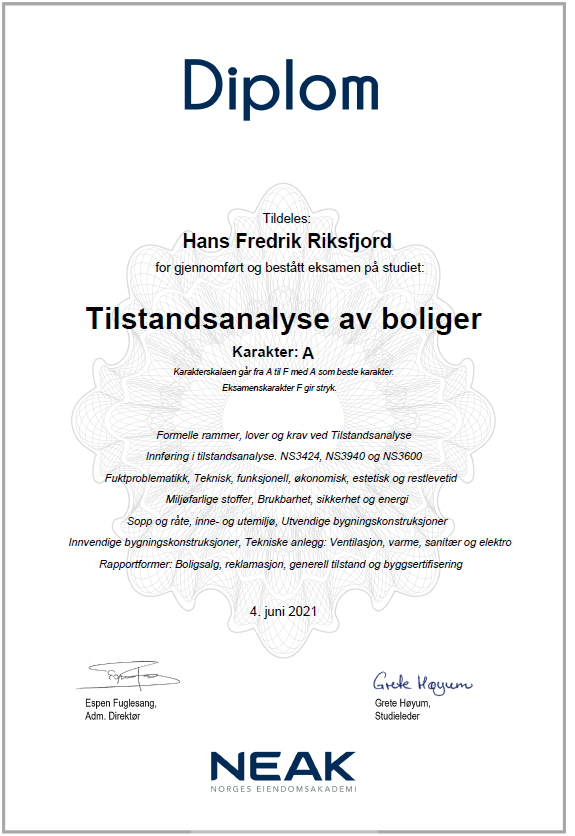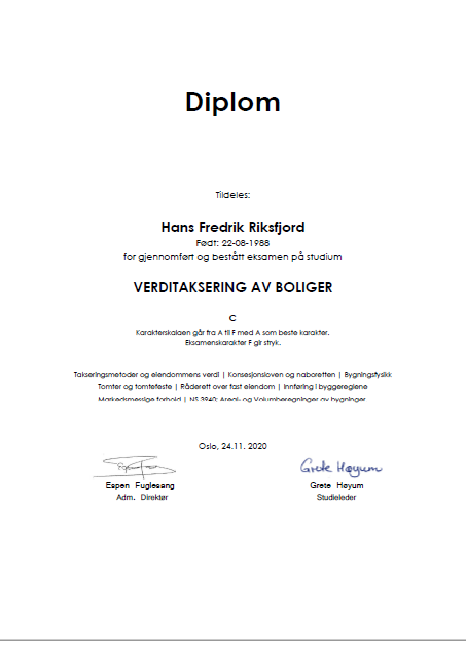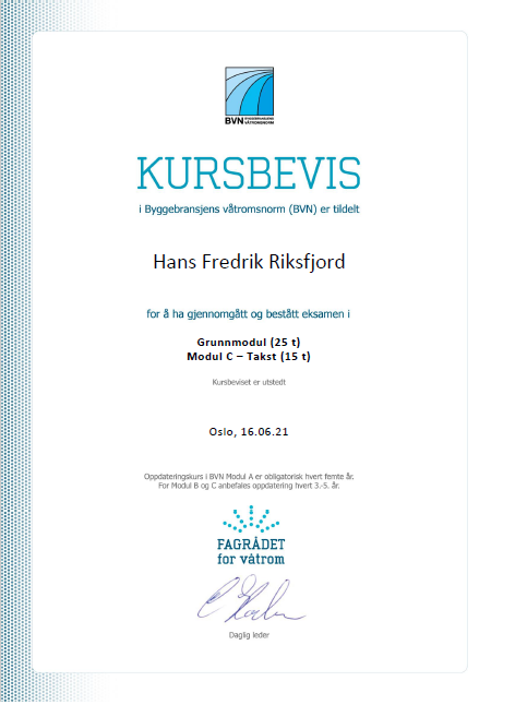 Etter ca. 12år som tømrer, ville Hans Fredrik gjøre noe annet, men i samme bransje. I 2018 bestemte han seg for å søke seg inn på Fagskole Bygg i Førde, deltidstudier over 3 år. I 2019 valgte han å ta takstmann utdanning i tillegg å søkte seg inn på takstmann studie gjennom NEAK, i samarbeid med Norsk Takst. Fra sommeren 2019 til sommeren 2021, kombinerte han 100% jobb som tømrer, fagskole og takststudie.